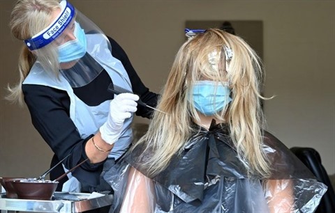 | Kerry Clegg s'occupe des cheveux d'une cliente à Birkenhead (Nord-Ouest) le 4 juillet. |