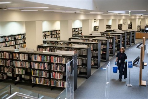 | Préparatifs avant la réouverture d'une bibliothèque publique à Manchester, en Angleterre, le 3 juillet. |