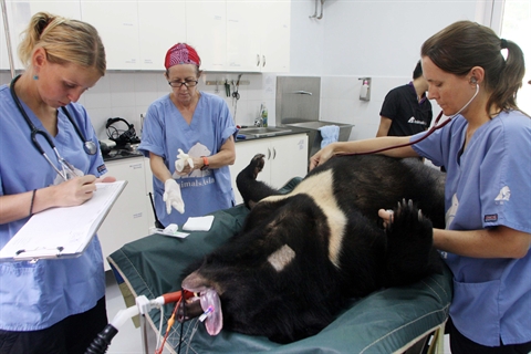 | Un ours rescapé d’une ferme d’extraction de bile est soigné par les médecins-vétérinaires. Photo : Trân Viêt/VNA/CVN |