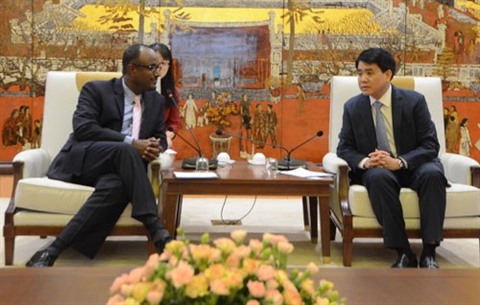 | Le président du Comité populaire de Hanoï, Nguyên Duc Chung (droite), et le directeur chargé de l’agriculture de la Banque mondiale pour l'Asie et le Pacifique, Nathan Belete. |
