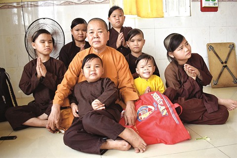 | La bonzesse Pham Thi Kim Sang et ses enfants adoptés. |