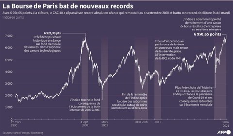 L'indice parisien a terminé à 6.950,65 points, battant son record de clôture établi la veille. En séance, il a même atteint le niveau inédit de 6.955,10 points, dépassant son record du 4 septembre 2000.
