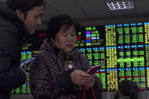 | Une investisseuse vérifie son téléphone portable à côté d'une carte électronique montrant des informations boursières à une maison de courtage à Shanghai, le 27 janvier. |