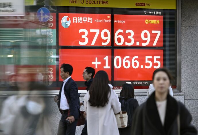 | L'écran affiche l'indice boursier Nikkei à Tokyo, au Japon. |
