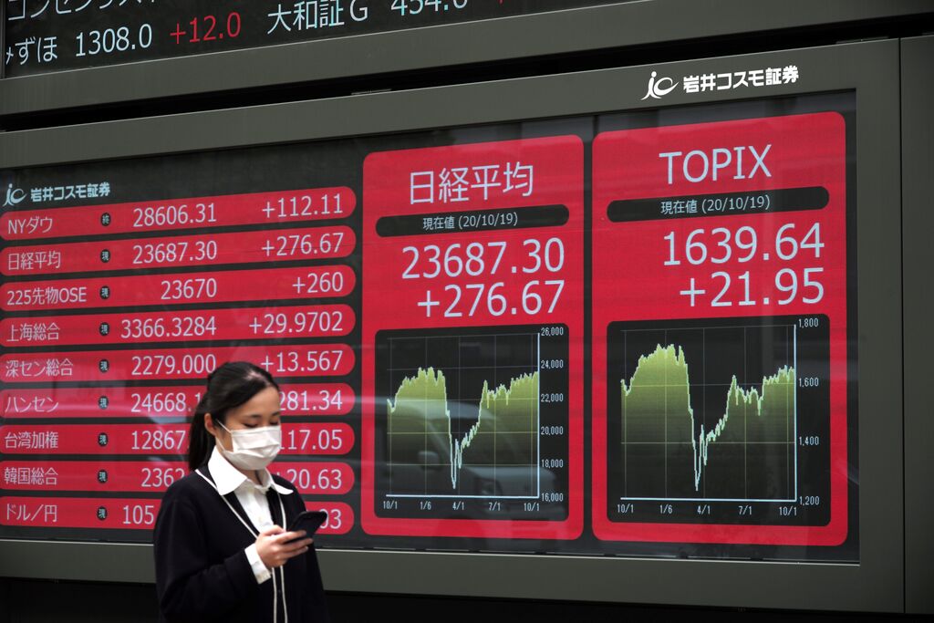 | Le tableau électronique affichant des indices de la Bourse de Tokyo. |