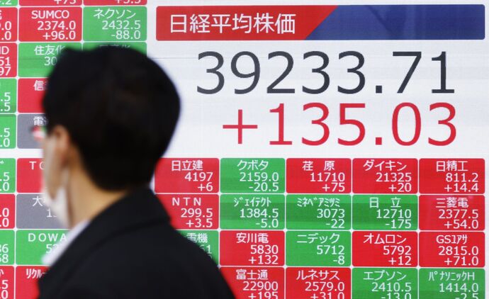 | L'écran affiche l'indice boursier Nikkei à Tokyo, au Japon, le 13 février. |
