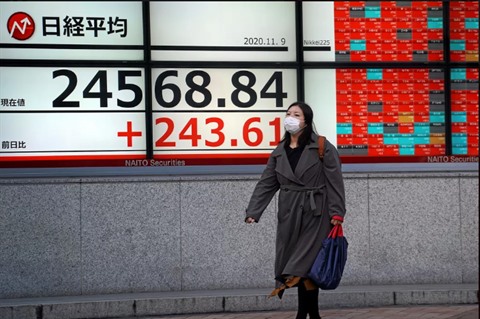 | Une passante masquée devant un tableau électronique de cotation de la Bourse de Tokyo |