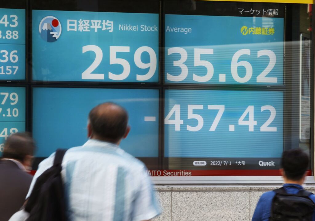 | Un homme regarde un tableau électronique montrant l'indice boursier à Tokyo, au Japon, en juillet 2022. |
