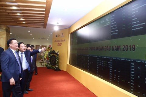 | La première séance de transactions de 2019 au Service de transactions boursières de Hanoï (HNX). |