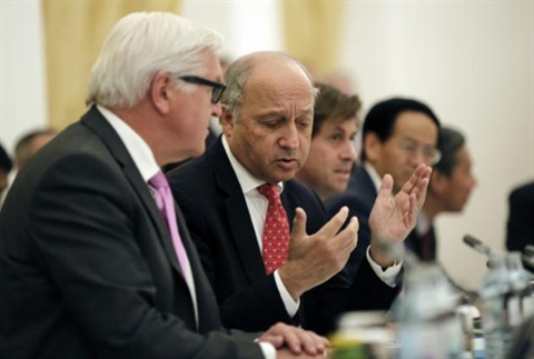 | Le ministre allemand des Affaires étrangères Frank-Walter Steinmeier (gauche) s'entretient avec son homologue français Laurent Fabius, le 11 juillet à Vienne. |