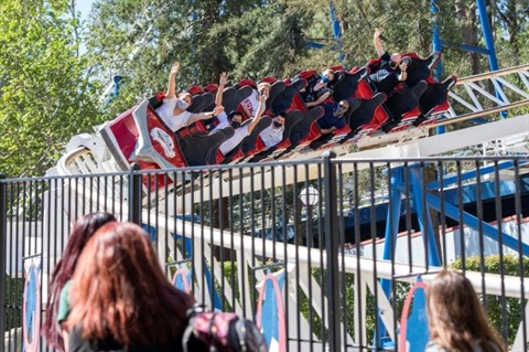 | Une attraction au parc Six Flags Magic Mountain de Valencia, Californie (États-Unis), lors de sa réouverture le 1er avril. |