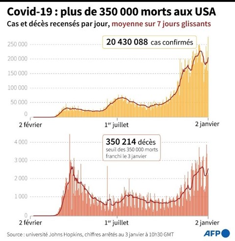 | Cas de COVID-19 et décès quotidiens liés au COVID-19 officiellement recensés aux États-Unis, au 2 janvier. Seuil des 350.000 morts franchi le 3 janvier. |