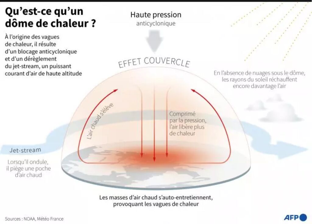 | Graphique expliquant le fonctionnement du "dôme de chaleur", qui entraîne des vagues de chaleur. |