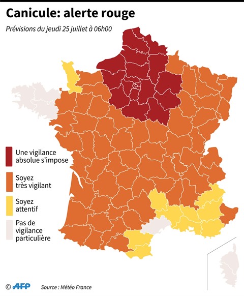 L'alerte rouge canicule, qui n'est utilisée que pour la troisième fois, après deux précédents en 2019, concernait déjà depuis vendredi 7 août Paris et huit autres départements, en raison "du risque de sur-mortalité lié à la pollution à l'ozone et au COVID, ainsi qu'en lien avec la sensibilité dans les zones fortement urbanisées", selon Météo-France.