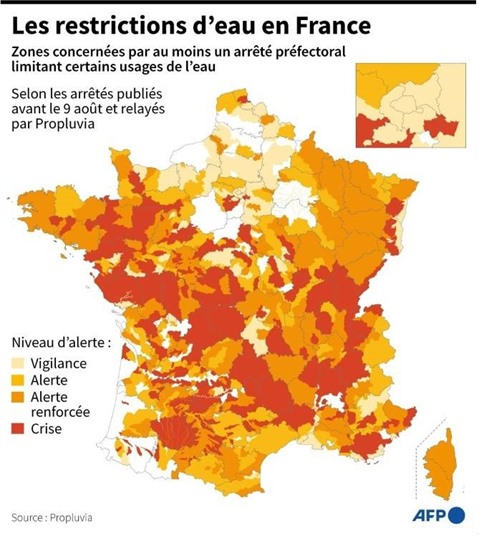 Mercredi 10 août, 21 départements étaient en "alerte renforcée", qui impose des réductions fortes des arrosages et des prélèvements pour l'agriculture, voire des interdictions de certains prélèvements, et 69 sont "en crise", où même les prélèvements d'eau pour l'agriculture sont interdits.