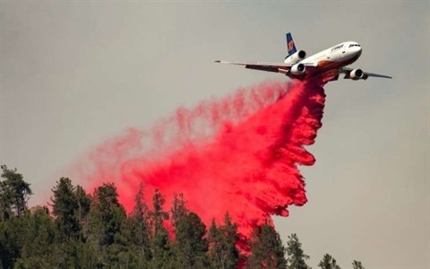 | Un avion bombardier d'eau largue du "retardant", un produit coloré (rouge) qui revêt la végétation d'une pellicule ignifuge, le long d'une crête pendant un incendie à Lakehead, en Californie, le 2 juillet. |