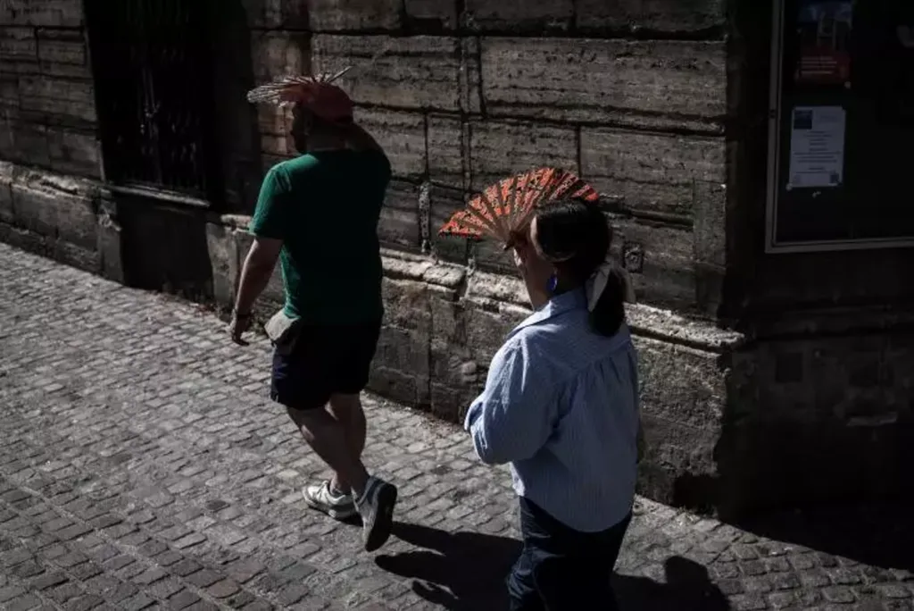 | Des passants se protègent du soleil avec des éventails, le 1er juillet à Paris en France. |