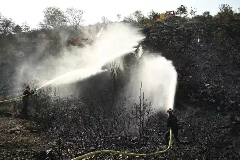 | Des pompiers tentent d'éteindre les braises du gigantesque incendie dans l'Aude, le 9 août à Albas. |