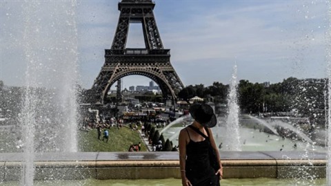 | Une femme se rafraîchit dans les fontaines du Trocadéro près de la Tour Eiffel à Paris, le 22 juillet. |