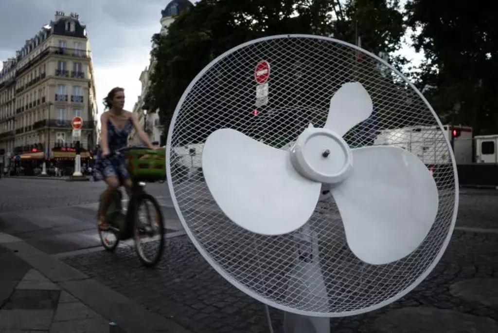 | Une cycliste circule près d'un ventilateur abandonné, le 27 juin à Paris. |