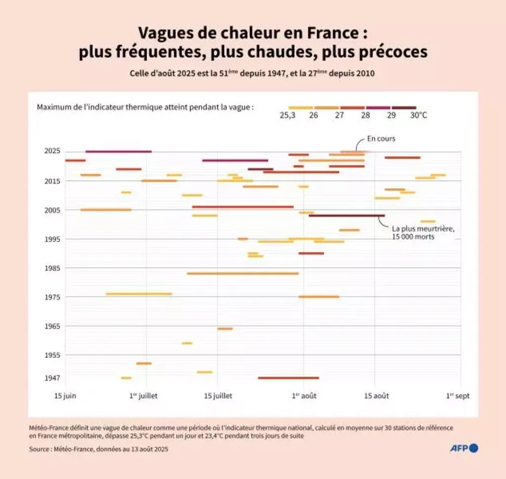La France subit depuis vendredi 15 août sa 51e vague de chaleur depuis 1947 et la 2e depuis le début de l’été, des épisodes rendus plus fréquents et plus intenses par le changement climatique.