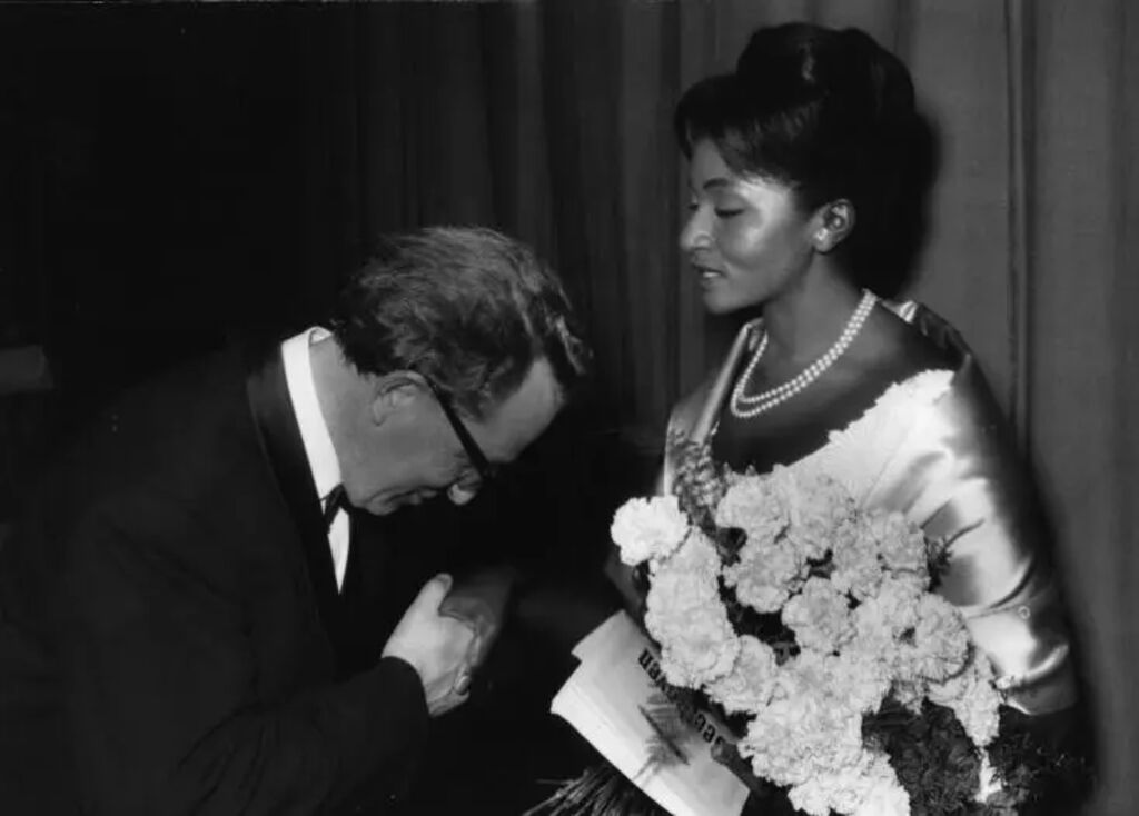 | Le directeur du Festival de Bayreuth, Wolfgang Wagner, s'incline devant la Grace Bumbry, le 24 juillet 1963. Il avait demandé à la cantatrice de chanter "Venus" dans Tannhaüser en 1961. |
