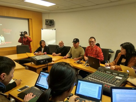 | Le réalisateur Trân Luc (pull rouge) lors de la conférence de presse présentant la pièce La cantatrice chauve, le 10 janvier à L'Espace. |