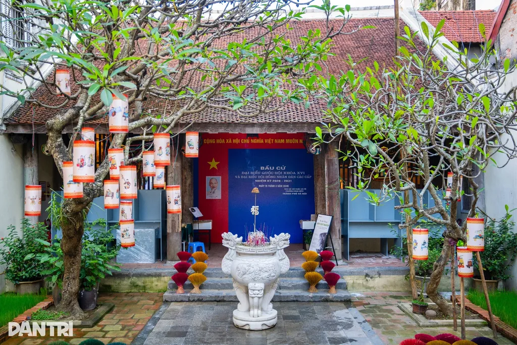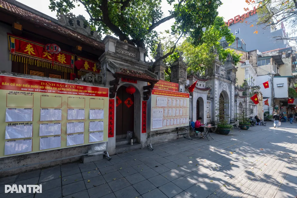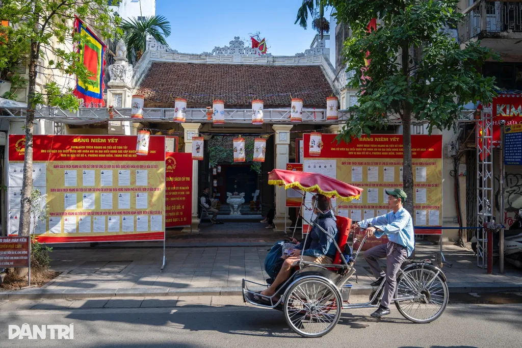 | À la maison commune et au temple Vu Thach, situé dans la rue Bà Triêu, drapeaux et banderoles électorales animent l’espace sacré. |