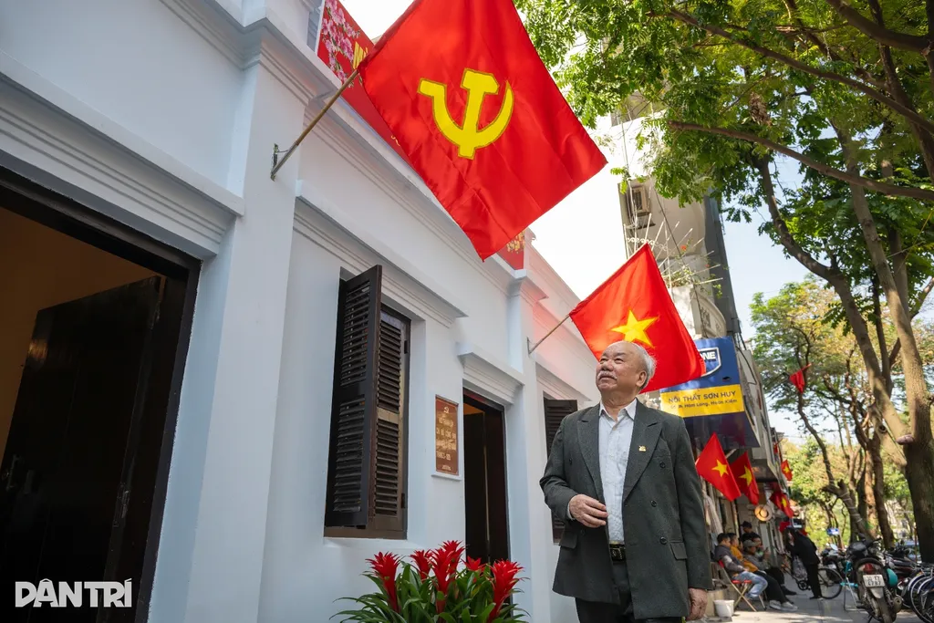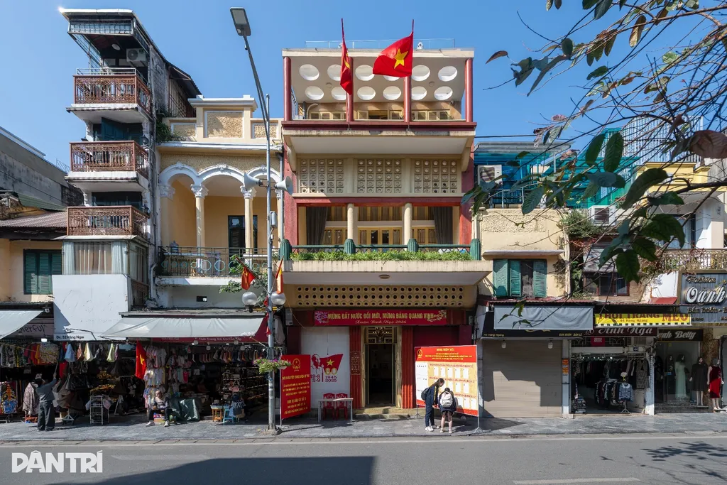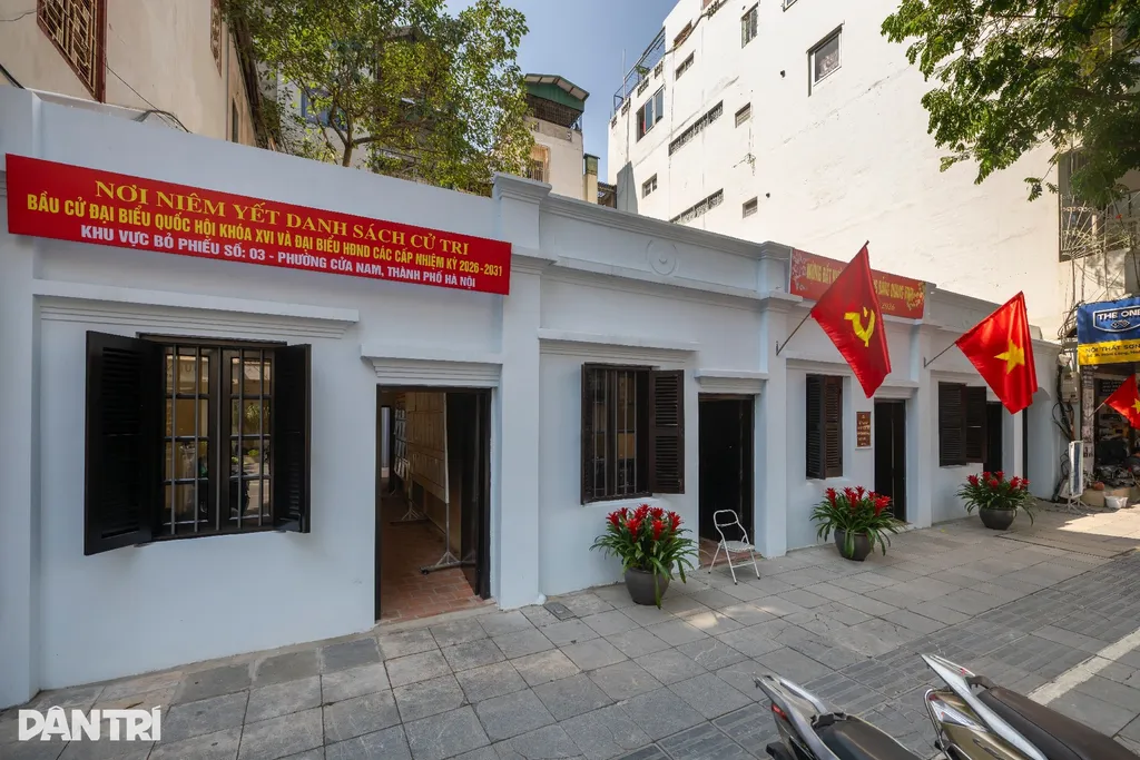 | La Maison du 5D Hàm Long, située dans le quartier de Cua Nam, où fut fondée en mars 1929 la première cellule communiste du Vietnam, se pare des couleurs du scrutin. |