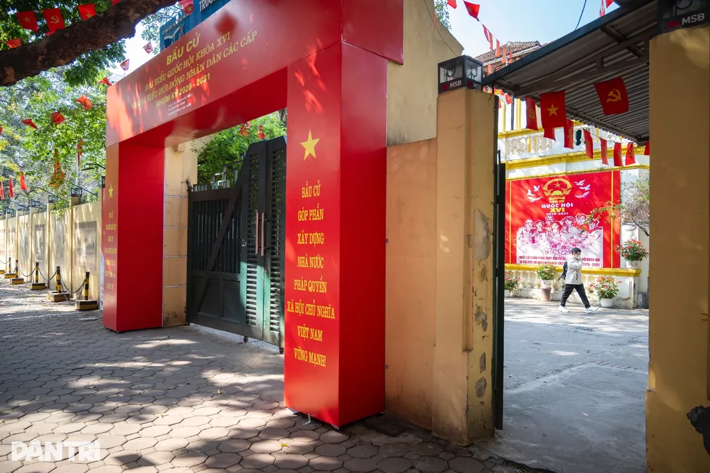 | À l’école primaire Tràng An, située dans la rue Nhà Chung, drapeaux et affiches électorales décorent l’entrée. |