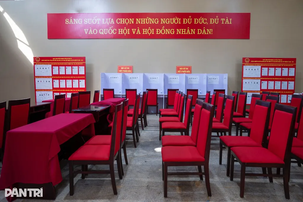 | Trinh Sao Mai, 74 ans, président de l’Association des personnes âgées du quartier de Cua Nam et chef du Bureau électoral N°3 de la circonscription électorale N°1 du quartier, veille aux préparatifs du bureau de vote. |