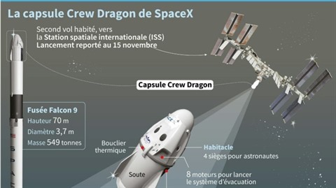 Ce premier vol "opérationnel" fait suite à la mission de démonstration réussie de mai à août, lors de laquelle deux astronautes américains ont été conduits vers l'ISS puis ramenés sur Terre sans encombre par SpaceX, première société privée à accomplir cette prouesse technologique.