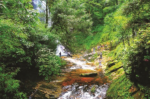 Pour y aller, les voyageurs traversent une belle forêt sillonnée de ruisseaux et longent le bien nommé ruisseau d’Or bordé de forêts de bambou Phyllostachys. L’itinéraire se poursuit avec une piste entourée de Rhododendrons rouges et jaunes.