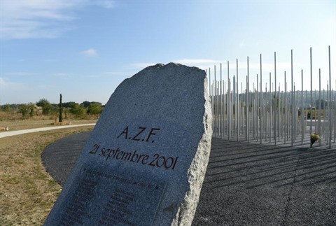 | Une pierre tombale portant les noms des victimes de l'explosion de l'usine chimique AZF à Toulouse, photographiée le 21 septembre 2016. |