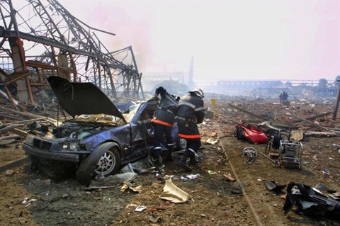 | Des pompiers essaient de sortir une victime de son véhicule sur le site de l'usine chimique AZF à Toulouse après l'explosion le 21 septembre 2001 |