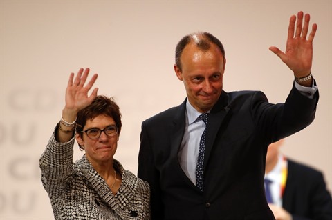 | Annegret Kramp-Karrenbauer (g) et Friedrich Merz lors d'un congrès de la CDU à Hambourg, le 7 décembre 2018. |