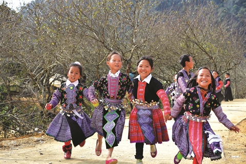 | De jeunes filles H’Mông s’amusent, vêtues de leurs tenues traditionnelles chatoyantes. |