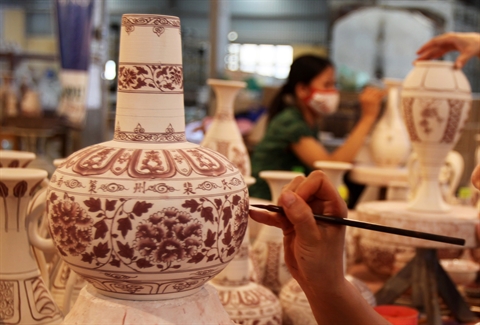 | Une artisane peint des jarres de céramique aux motifs originaux et uniques dans un atelier de Chu Dâu. |