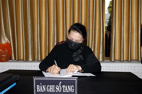 | La présidente de l'Assemblée nationale Nguyên Thi Kim Ngân exprime ses condoléances dans le registre de deuil. |