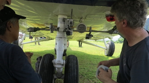 | Un hélicoptère qui transporte des équipements dans la grotte. |