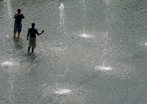 | Des personnes se rafraichissent dans une fontaine lors de grosses chaleurs à Singapour. |
