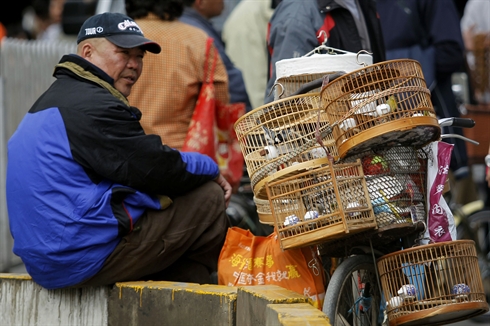 | Un vendeur attend des clients dans un marché d'oiseaux, à Pékin, Chine. |