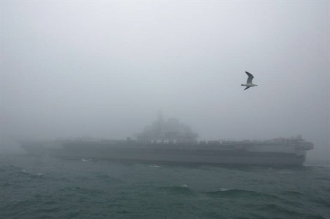 | Le porte-avions chinois "Liaoning" en mer près de Qingdao, le 23 avril en Chine. |