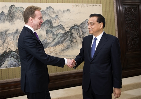 | Le Premier ministre chinois Li Keqiang (droite) et le ministre norvégien des Affaires étrangères Borge Brende, le19 décembre à Pékin. |