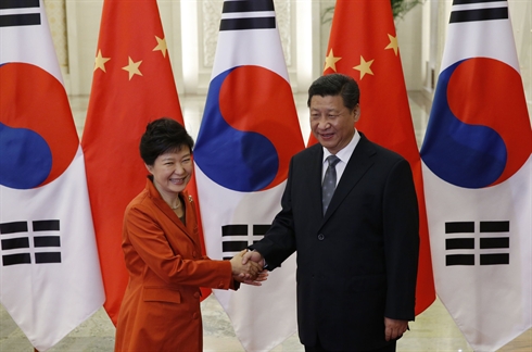 | Le président chinois Xi Jinping et son homologue sud-coréenne Park Geun-hye, le 10 novembre à Pékin. |