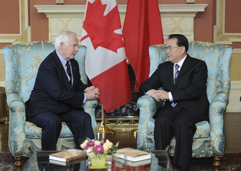 | Li Changchun (droite), un haut responsable du Parti communiste chinois (PCC), lors d'un entretien avec David Johnston, gouverneur général du Canada. Photo : XINHUA/VNA/CVN |