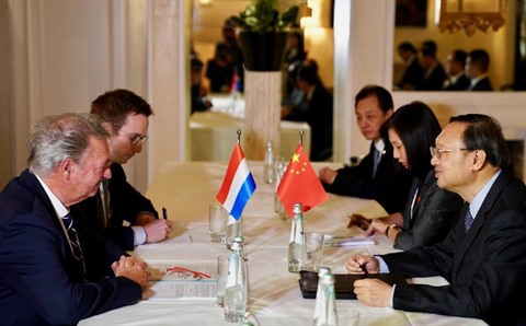 | Rencontre entre Yang Jiechi (1er à droite), membre du politburo du PCC, et Jean Asselborn (1er à gauche), ministre luxembourgeois des Affaires étrangères. |