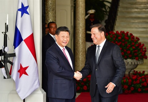 | Le président du Panama, Juan Carlos Varela (droite), accueille son homologue chinois Xi Jinping le 3 décembre, à Panama. |
