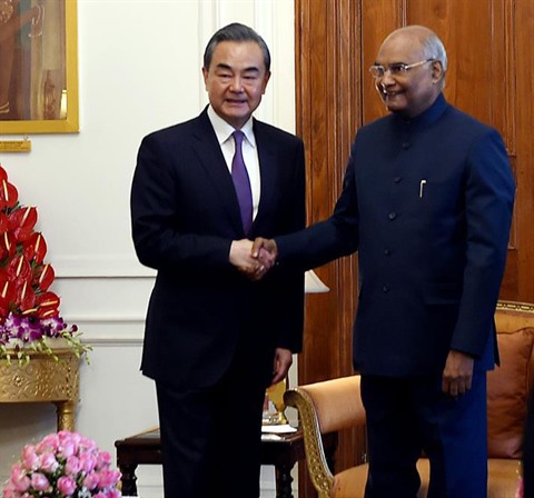 | Le conseiller d'État chinois et ministre des Affaires étrangères Wang Yi (gauche) et le président indien Ram Nath Kovin. |