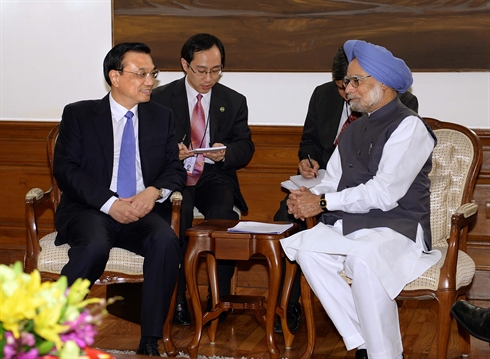 | Le Premier ministre chinois Li Keqiang (gauche) et son homologue indien Manmohan Singh, le 19 mai à New Delhi (Inde). |